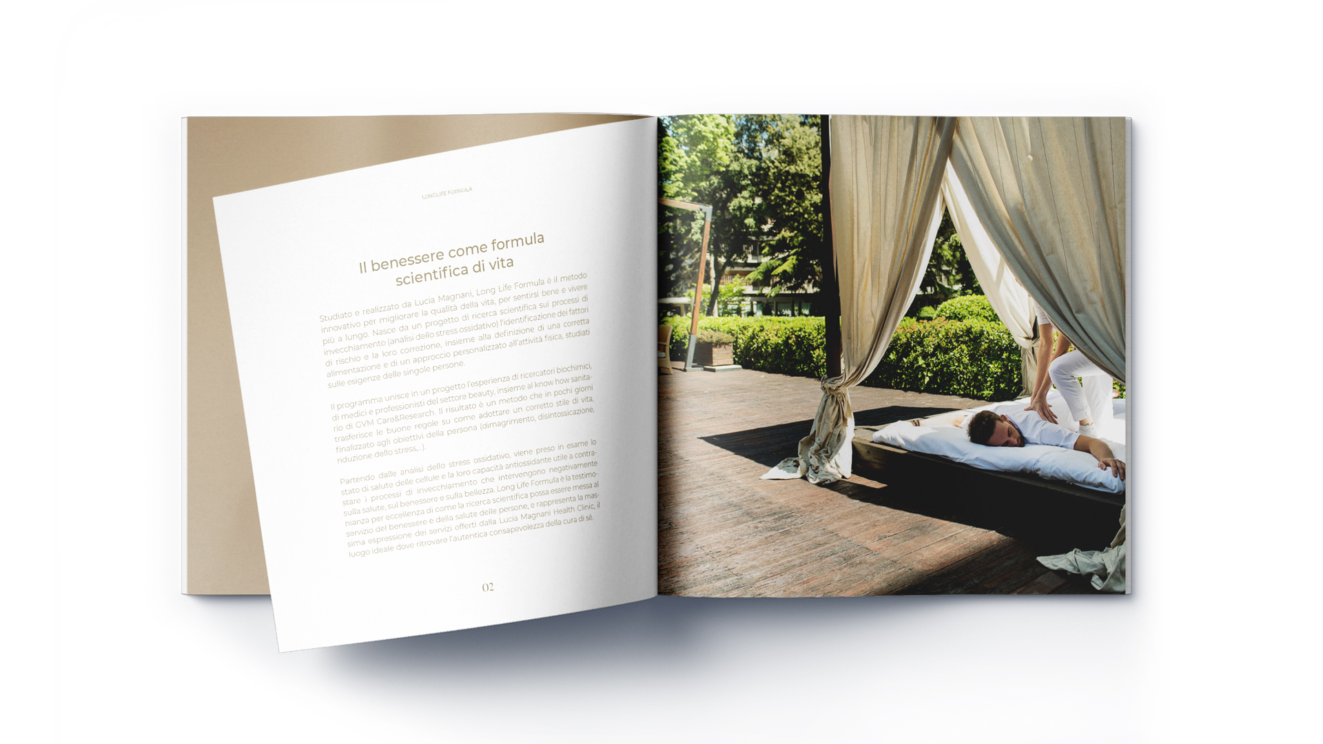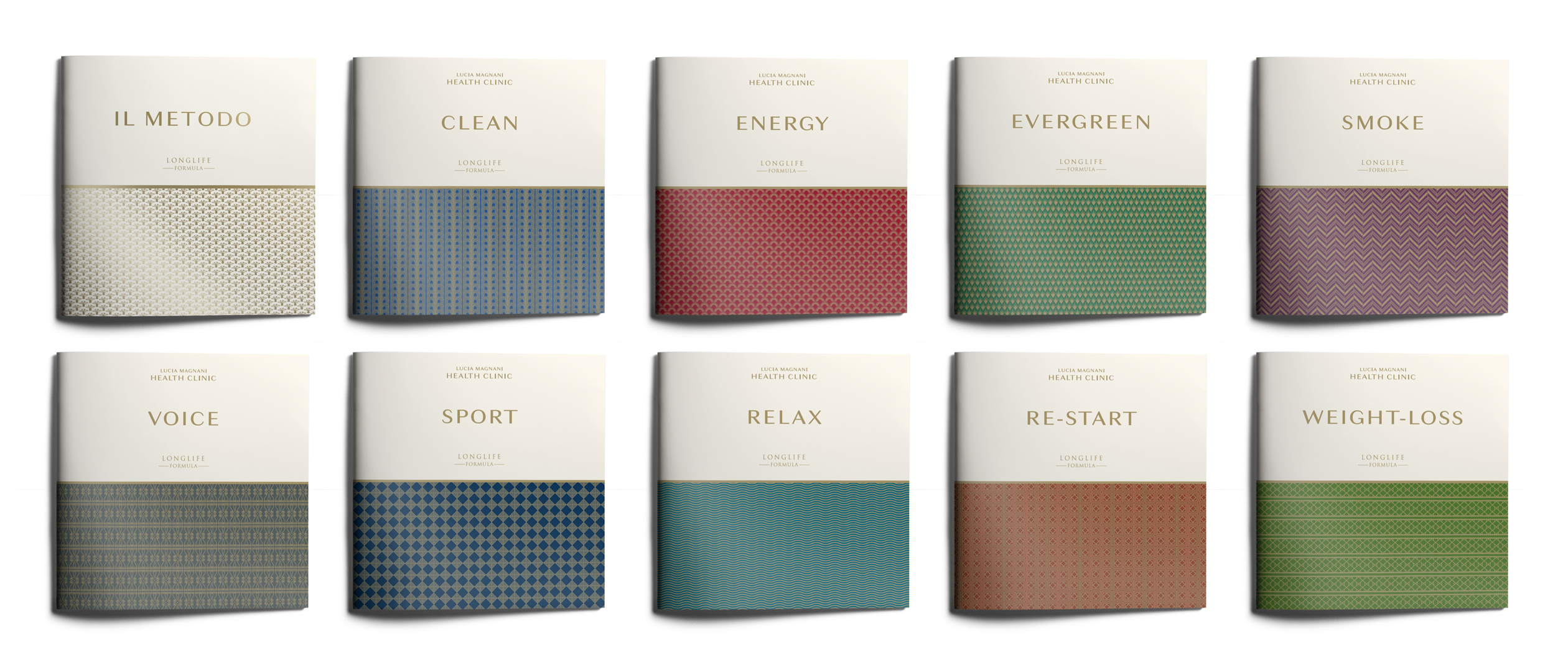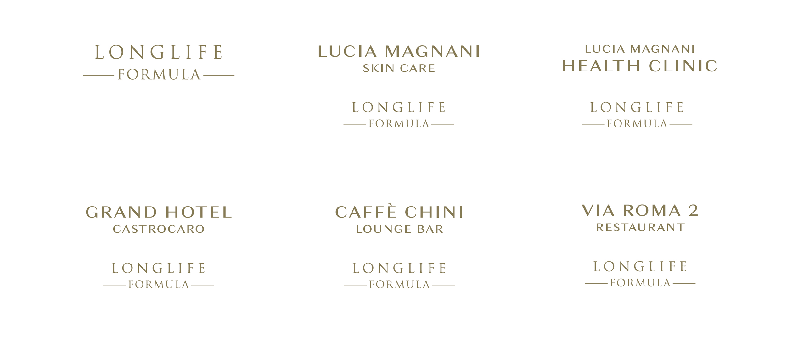 L’identità del marchio si struttura attorno a una chiara architettura di brand, dove il payoff “Longlife Formula” opera come endorser. Lucia Magnani Health Clinic” è il cosiddetto umbrella brand che si declina sull’entità principale, la clinica stessa, e su estensioni come la linea di skin care, garantendo un’immediata riconoscibilità. La coerenza visiva è supportata da un design elegante che utilizza una palette di colori neutri abbinati all’oro della tipografia, che conferisce un senso di pulizia e preziosità. Elemento distintivo è la serie di motivi geometrici (pattern) impiegati per differenziare i vari percorsi di benessere nella clinica e per unificare visivamente gli asset del gruppo, inclusi il Grand Hotel Castrocaro e il Caffè Chini.