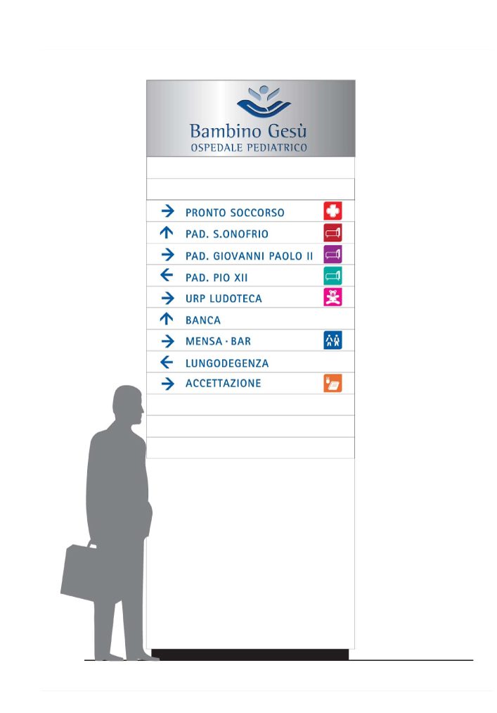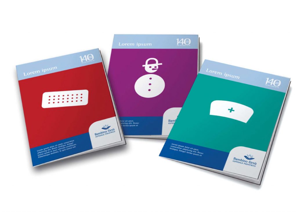 Per espressa richiesta della committenza, l’intervento di brand identity doveva costituire un’evoluzione di quella preesistente. Inarea ha ridisegnato il pittogramma-simbolo: un bambino che abbraccia il mondo, con un design che comunica accoglienza, protezione e dimensione globale. L’immagine non solo riflette la missione dell’ospedale di prendersi cura dei bambini, a livello internazionale, ma sottolinea anche la sua connessione con il Vaticano e il suo ruolo di eccellenza pediatrica. L’elemento figurativo è affiancato dal logotipo “Bambino Gesù” e dal descriptor “Ospedale Pediatrico”. L’architettura di brand è chiara, distinguendo le diverse entità legate all’istituzione: l’Ospedale pediatrico, la Fondazione, e l’Associazione, ognuna con una declinazione visiva che mantiene la coerenza del master brand. La palette cromatica è centrata su tonalità azzurre o blu, che trasmettono serenità e fiducia. È bilanciata da colori complementari, suggerendo un ambiente sia professionale sia accogliente per i bambini. La tipografia, scelta per la sua leggibilità, adotta carattere istituzionale ma amichevole, fondamentale per un contesto medico-sociale che opera a contatto con i più piccoli.